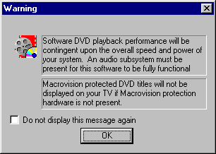 This warning also informs you of the Macrovision restriction. Macrovision is an antitaping process that modifies a signal so that it appears unchanged on most televisions but is distorted when played back from videotapes. Our software will not allow playback of DVDs with graphic boards that contain a TV out component, but does not utilize Macrovision to prevent the creation of illegal export of the DVD title. |