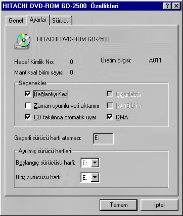 WinDVD'yi çalıştırmadan önce, DVD-ROM sürücünüzün DMA ayarını açtığınızdan emin olun. Bu, masaüstünüzdeki Bilgisayarım simgesini sağ tıklatıp, Özellikleri seçip, Aygıt Yöneticisi sekmesini seçerek, CD-ROM aygıtını çift tıklatarak ve hazır olan DVD-ROM sürücüsünü seçerek yapılır. Şimdi, Ayarlar sekmesini seçerek ve DMA onay kutusunu etkinleştirerek özellikleri seçin. (görmeniz gerekenlerin bir örneğini aşağıdaki resimde bulabilirsiniz.)