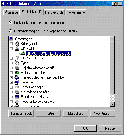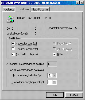 A WinDVD indítása előtt ellenőrizzük, hogy a DVD-ROM meghajtó DMA hozzáférése engedélyezve van. Ehhez kattintsunk a jobb gombbal a Sajátgép ikonra az Asztalon, válasszuk a Tulajdonságokat, majd az Eszközkezelőt. Itt kattintsunk kétszer a CD-ROM eszközre, majd válasszuk ki a DVD-ROM meghajtót. Ezután válasszuk a Tulajdonságokat majd a beállítások lapot, és engedélyezzük a DMA jelölőnégyzetet. (az alábbi képek jelzik, hogy mit kéne látnunk.)