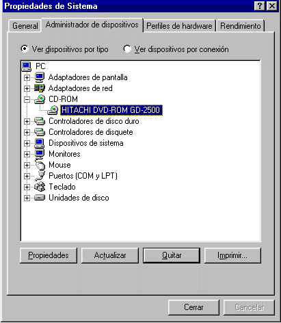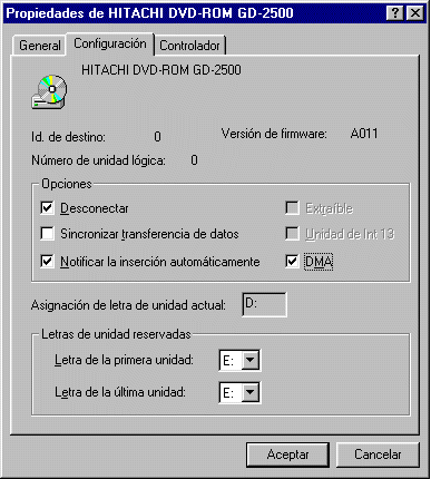 Compruebe que está activado el valor DMA de la unidad de DVD-ROM antes de ejecutar WinDVD. Para ello, haga clic con el botón derecho del ratón en el icono Mi PC del escritorio, seleccione Propiedades, a continuación seleccione la ficha Administrador de dispositivos, haga doble clic en el dispositivo CD-ROM y seleccione la unidad de DVD-ROM. A continuación, seleccione las propiedades; para ello, vaya a la ficha Configuración y active la casilla de verificación DMA. (Las imágenes que aparecen a continuaciónson un ejemplo de lo que debería ver).